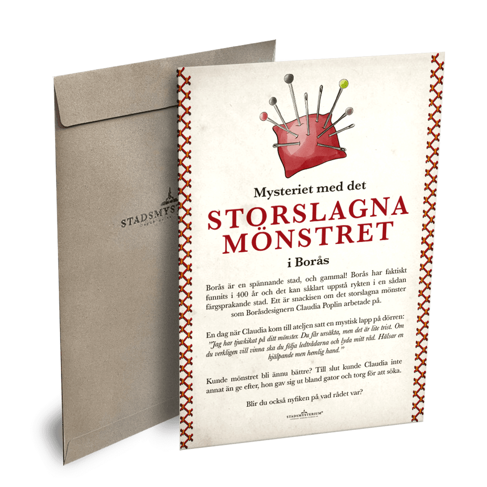 STADSMYSTERIUM® är en promenadaktivitet där man letar ledtrådar och svarar på frågor. Promenaden är utomhus i stadsmiljö bland gator och torg och tar cirka en timma. Avsluta gärna med att lösa mysteriet över en fika.